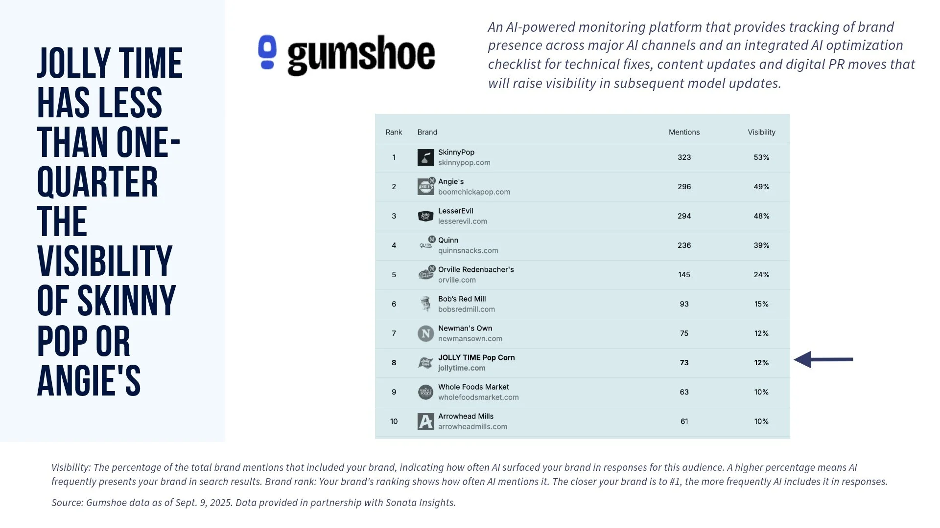 In fact, Gumshoe data showed that Jolly Time had only about a quarter of the visibility that brands like SkinnyPop or Angie’s Boomchickapop enjoyed in AI search results for “healthy snack options.”