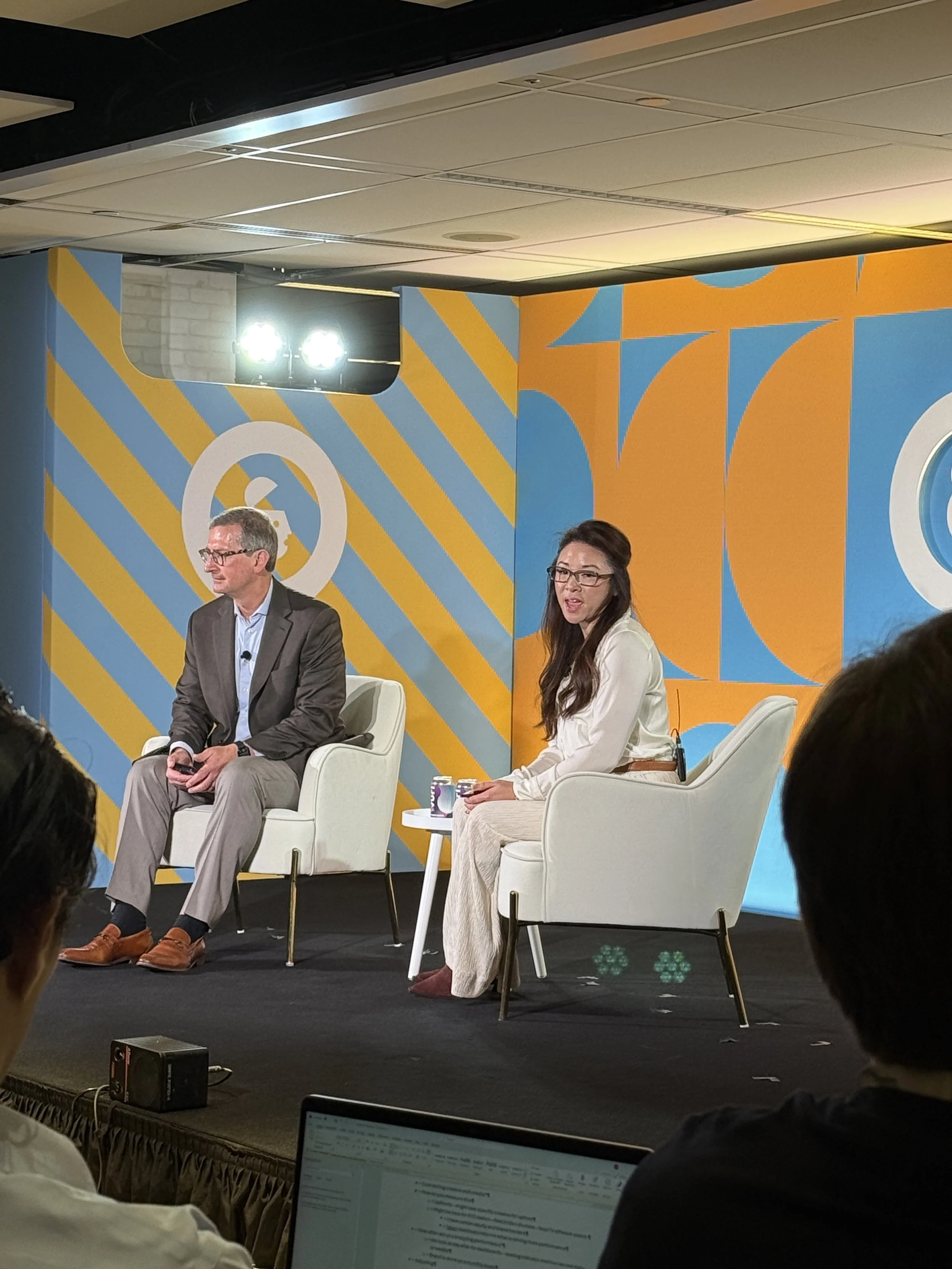 Barton Crockett of Rosenblatt Securities and Jessica Chan of Perplexity on stage at Advertising Week.